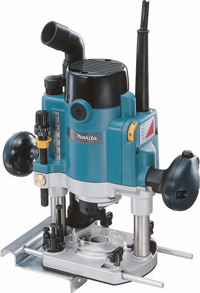 Ручний фрезер Makita RP0910, оснащений двигуном потужністю 900 Вт, призначений для ефективної обробки м'якої та твердої деревини, а також похідних матеріалів, таких як плити МДФ та пластик. Інструмент забезпечує точне налаштування глибини фрезерування до 57 мм, що дозволяє виконувати складні та делікатні роботи.