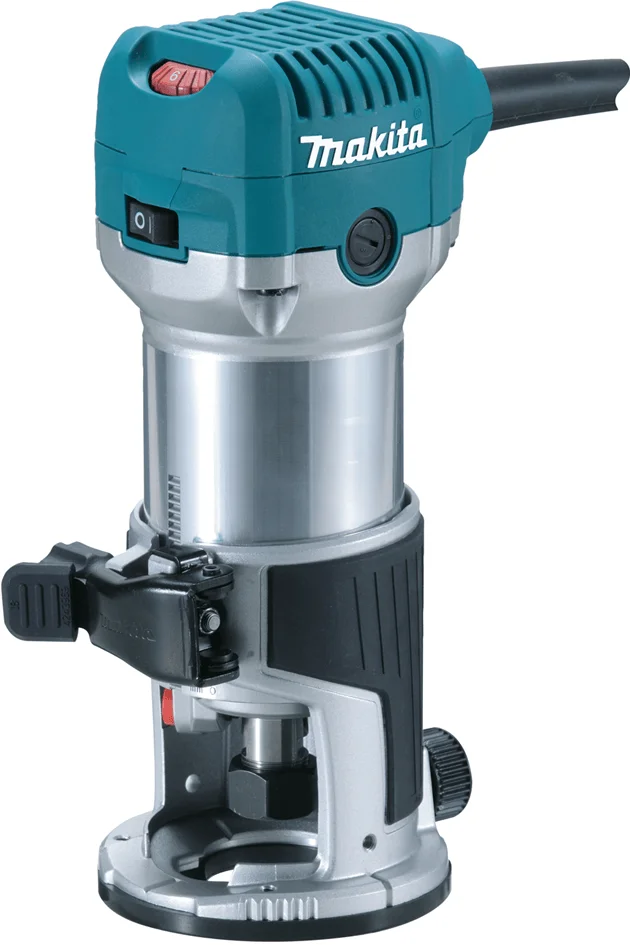 Одноручний кромочний фрезер Makita RT0700C є професійним інструментом, що вирізняється високою універсальністю завдяки комплекту з трьох змінних основ. Це дозволяє виконувати широкий спектр робіт, від точного копіювання до вибірки пазів та зняття фасок.