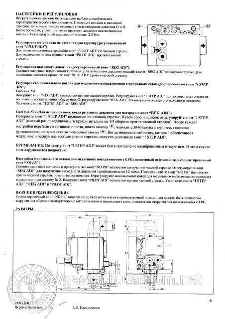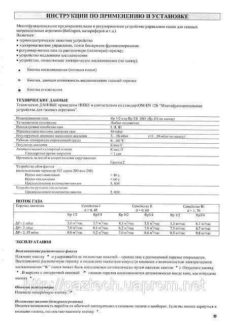 - Регулювання параметрів: Передбачена можливість налаштування вихідного тиску в діапазоні 3–18 мбар, регулювання потоку газу на запальний пальник та ступінчастого відкривання основного клапана.