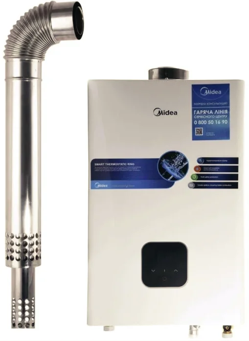 Проточна газова колонка Midea JSG22-12HC2 Turbo призначена для швидкого нагріву води в квартирах та приватних будинках, забезпечуючи продуктивність до 12 літрів гарячої води за хвилину. Модель має номінальну теплову потужність 22 кВт та оснащена турбованою системою відведення відпрацьованих газів, що дозволяє використовувати її в приміщеннях без традиційного димоходу.