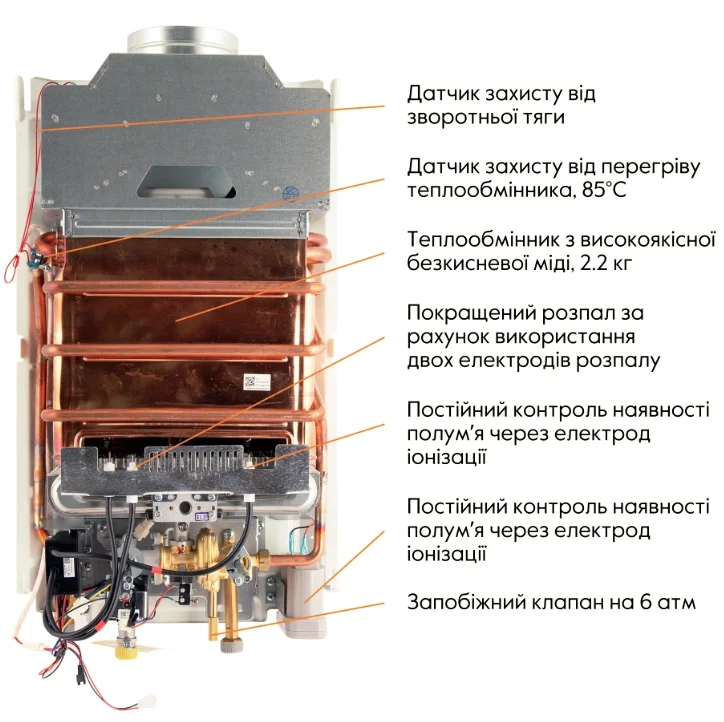 - Надійний теплообмінник: Теплообмінник масою 2,2 кг сприяє ефективному та швидкому нагріву води.