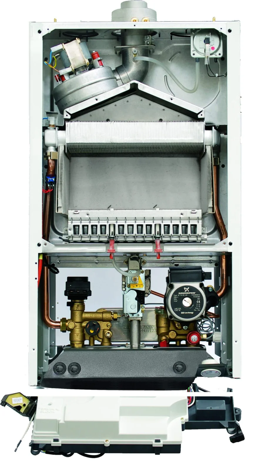 Система безперервної електронної модуляції полум'я дозволяє точно регулювати теплову потужність в діапазоні від 9.3 до 24 кВт, забезпечуючи стабільну роботу навіть при зниженому вхідному тиску природного газу до 5 мбар. Це гарантує оптимальне споживання палива та адаптацію до різних умов експлуатації. Вбудований енергоощадний циркуляційний насос з автоматичним повітровідвідником та розширювальний бак об'ємом 8 літрів забезпечують ефективну циркуляцію теплоносія в системі. Первинний мідний теплообмінник має спеціальне антикорозійне покриття, що подовжує термін його служби.