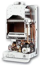 Конструкція котла передбачає використання роздільних теплообмінників: первинний виготовлений з міді, що гарантує високу теплопровідність та довговічність, а вторинний, призначений для гарячого водопостачання, виконаний з нержавіючої сталі. Це рішення забезпечує швидке нагрівання води та її стабільну температуру при витраті до 16 літрів на хвилину, мінімізуючи час очікування. Відкрита камера згоряння з природним відведенням продуктів згоряння через димохід діаметром 130 мм спрощує монтаж у приміщеннях з відповідною вентиляційною системою.