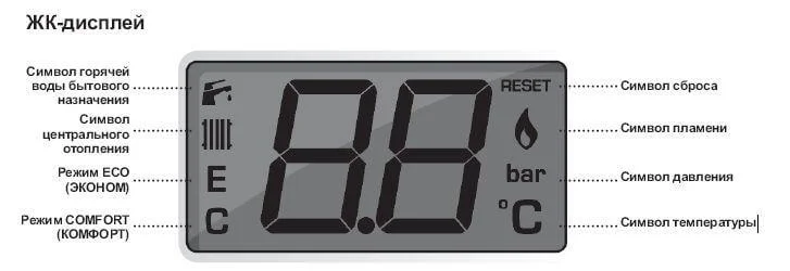 - Інформативний дисплей та керування: Оснащений РК-дисплеєм, який відображає поточні показники температури, тиску води та коди помилок, а також цифровим та аналоговим манометрами для зручного моніторингу стану системи.