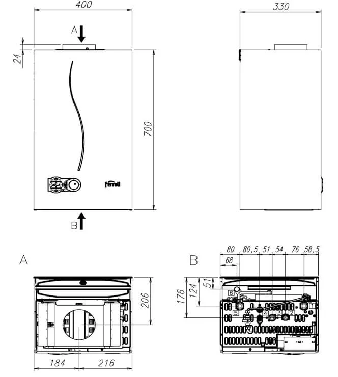 Газовий котел Ferroli DIVAtech С 24 D atmo є димохідним агрегатом з відкритою камерою згоряння, призначеним для встановлення в приміщеннях з ефективною системою постійної вентиляції. Це забезпечує належний приплив повітря для горіння та безпечне відведення продуктів згоряння. Котел потужністю 24 кВт здатен опалювати площу до 240 м² та забезпечувати гарячою водою з продуктивністю 13.4 л/хв.