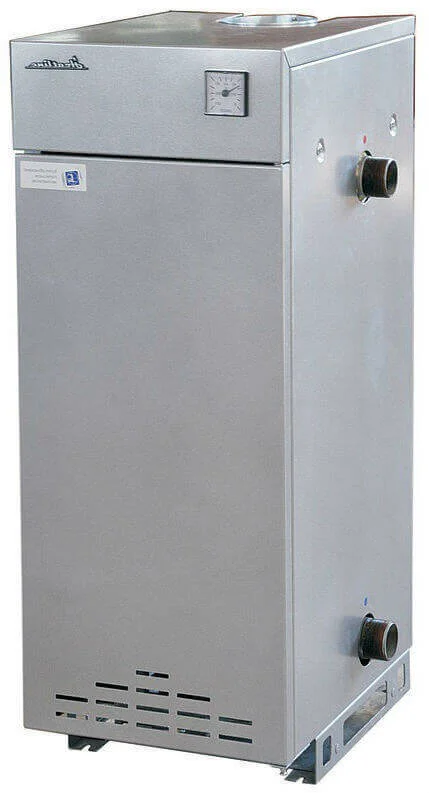 Двоконтурний газовий котел Heatline KB-HLст (АОГВ) 41В - Universal потужністю 12 кВт призначений для ефективного опалення приміщень площею до 120 м² та забезпечення їх гарячою водою. Ця модель є підлоговою, димохідною, що свідчить про її енергонезалежність та простоту в експлуатації, оскільки не потребує підключення до електромережі для базового функціонування. Завдяки вбудованому контуру гарячого водопостачання, котел забезпечує продуктивність до 4.5 літрів гарячої води за хвилину при дельті температури 25 °C, що є достатнім для побутових потреб.