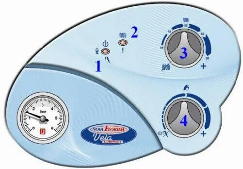 - Зручне управління: інтуїтивно зрозуміла панель управління містить манометр, світлові індикатори для діагностики, регулятори температури для контурів опалення та ГВП, а також перемикач літнього/зимового режимів, що дозволяє оптимізувати споживання газу.