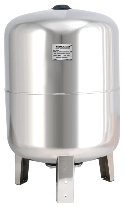 Корпус гідроакумулятора виготовлений з високоякісної нержавіючої сталі, що забезпечує виняткову стійкість до корозії та значно подовжує термін експлуатації пристрою, особливо у вологих умовах. Товщина стінки корпусу становить не менше 1 мм, що гарантує міцність та надійність конструкції. Всередині розташована змінна мембрана з вулканізованої гуми типу EPDM, яка є харчовою та надійно ізолює воду від контакту з металевими стінками бака. Це запобігає корозії та зберігає якість води, що особливо важливо для систем питного водопостачання.