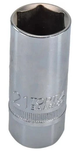 Шестигранна форма головки Toptul розміром 21 мм забезпечує максимальний контакт з гранями свічки запалювання, зменшуючи ризик зминання та пошкодження. Виготовлена з хром-ванадієвої сталі CR-V, вона має підвищену міцність та стійкість до зношування при регулярному використанні.