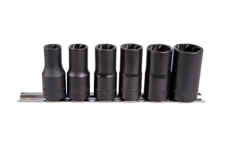 Набір із шести шестигранних головок діаметром від 10 до 19 мм призначений для зняття пошкоджених, закислих або округлих гайок та болтів. Головки виготовлені з легованої сталі SNCM, що забезпечує підвищену стійкість до зносу при контакті з деформованими кріпленнями. Посадковий квадрат 1/2" сумісний з ручними ключами.