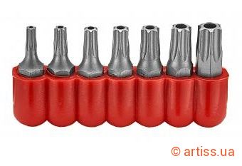 У набір входять 7 біт Torx з отвором довжиною 25 мм: T10H, T15H, T20H, T25H, T27H, T30H, T40H.