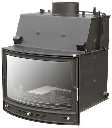 Конструкція каміна виконана з сертифікованої сталі товщиною 4-6 мм, що гарантує довговічність та надійність експлуатації. Дверцята оснащені жаростійким панорамним склом, здатним витримувати температуру до 800°C, що забезпечує широкий огляд полум'я та створює затишну атмосферу. Система чистого скла (СВТ) запобігає осіданню кіптяви, зберігаючи прозорість скла протягом тривалого часу горіння. Подача повітря для горіння здійснюється виключно ззовні, що сприяє оптимальному спалюванню палива та підвищує безпеку.