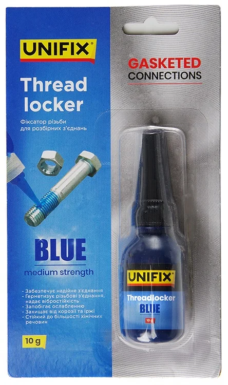 Фасується в упаковку об'ємом 10 г. Фіксатор різьби синій Unifix застосовується в машинобудуванні, автомобільній промисловості, будівництві та для обслуговування промислового обладнання там, де потрібно забезпечити стабільність розбірних вузлів.