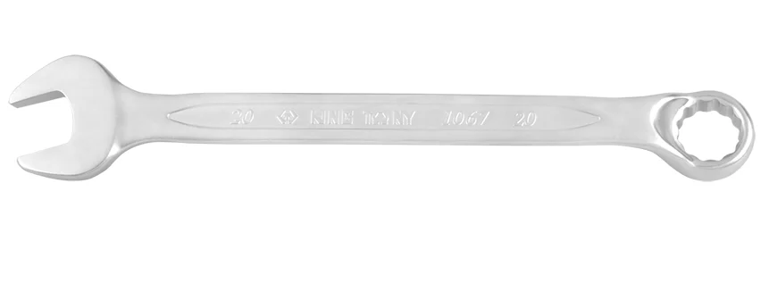 Комбінований ключ King Tony (1067-11) розміром 11 мм виготовлений з високоякісної хромованадієвої сталі (Cr-V), що забезпечує його міцність та стійкість до значних навантажень. Цей двосторонній інструмент поєднує ріжкову та накидну частини, пропонуючи універсальність для роботи з різними типами кріплень.