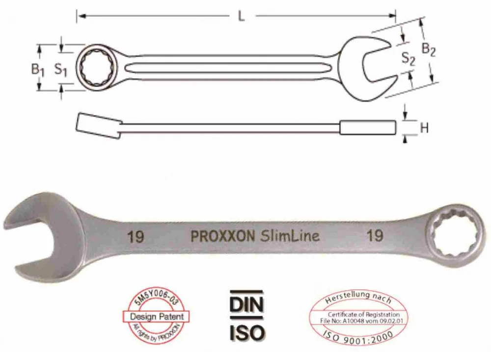 Комбінований гайковий ключ Proxxon Slim-Line має розмір 5,5 мм та виконаний за стандартами ISO/DIN. Його конструкція є двосторонньою: з одного боку розташований відкритий зігнутий зіщіп на 15°, а з іншого — кільцевий накидний на 12 граней. Така будова дозволяє швидко знімати та затягувати гайки в обмежених умовах, де прямий ключ неможливо застосувати.