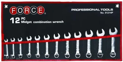 Укорочені комбіновані ключі Force (51214P) розмірами від 8 до 19 мм, представлені в наборі з 12 одиниць, розроблені для зручної та точної роботи з різними типами кріплень. Кожен ключ поєднує рожкову та накидну частини, що дозволяє ефективно працювати в обмежених просторах та забезпечує доступ до гайок і болтів під кутом 15°. Накидна частина має 12-гранний профіль, що сприяє надійному захопленню кріплення.
