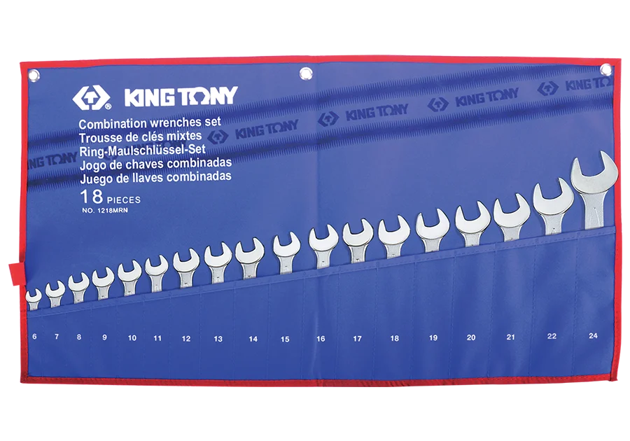Набір комбінованих ключів King Tony 1218MRN включає 18 предметів з метричними розмірами від 6 до 24 мм, що охоплює найбільш затребувані розміри для широкого спектра робіт. Кожен ключ має комбіновану конструкцію з 12-гранним профілем накидної частини та прямим ріжковим профілем, що забезпечує універсальність використання та надійне захоплення кріплення. Кут нахилу накидної частини становить 15°, що полегшує роботу у важкодоступних місцях.