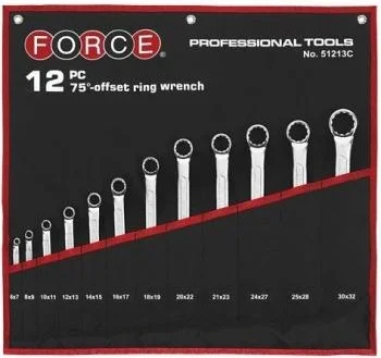 Відхилення робочої частини під кутом 75° робить набір накидних ключів Force 51213C зручним для роботи з кріпильними елементами в обмежених просторах або під незвичним кутом, де стандартні ключі можуть бути неефективними. Комплект складається з 12 високоякісних ключів метричних розмірів від 6 до 32 мм.