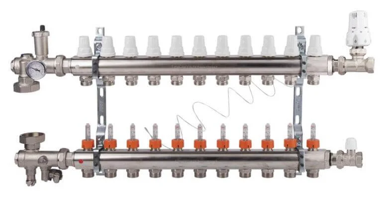 - Точне регулювання: Вбудовані витратоміри дозволяють точно налаштовувати потік теплоносія в кожному з 11 контурів, оптимізуючи розподіл тепла.