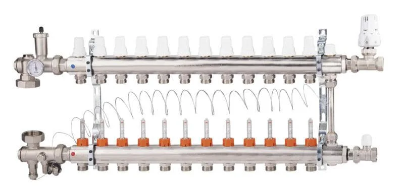 Колектор має 12 виходів, що дозволяє підключати до 12 окремих контурів теплої підлоги. Він забезпечує просте та точне регулювання витрати теплоносія в кожному контурі, а також можливість повного перекриття окремих гілок системи за потреби. Завдяки особливій формі кронштейнів, підключення труб до кожного виходу колектора є максимально спрощеним, а габаритні розміри, особливо по глибині, зменшені. Це дозволяє встановлювати колектори в стінах та приміщеннях з обмеженою площею.
