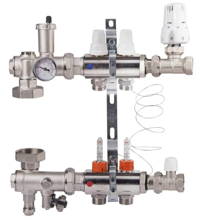 Колекторна група Icma 1" з 2 виходами та витратоміром A3K013APG06 призначена для ефективного розподілу теплоносія в системах водяної теплої підлоги, забезпечуючи точне керування опаленням в окремих контурах. Цей комплект дозволяє легко регулювати витрату теплоносія в кожному контурі та, за потреби, повністю перекривати їх, оптимізуючи тепловий режим у приміщенні.