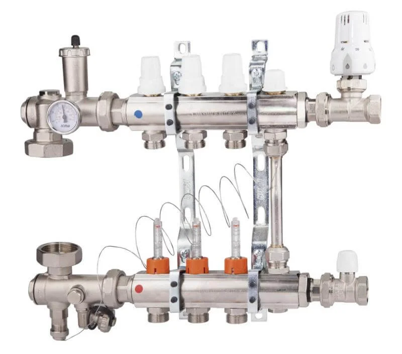 - Точне регулювання: Вбудовані витратоміри дозволяють здійснювати просте та точне налаштування витрати теплоносія в кожному контурі.