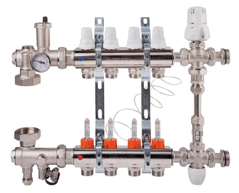 Виготовлена з високоякісної латуні CW617N (UNI EN 12165), колекторна група гарантує надійність та довговічність. Прокладки з EPDM забезпечують герметичність з'єднань, а ручки з ударостійкого полістиролу – зручність керування. Максимальний робочий тиск системи становить 10 бар, що відповідає стандартам безпеки для опалювальних систем. Наявність витратомірів у комплекті дозволяє точно регулювати потік теплоносія в кожному контурі, забезпечуючи рівномірний обігрів та енергоефективність.