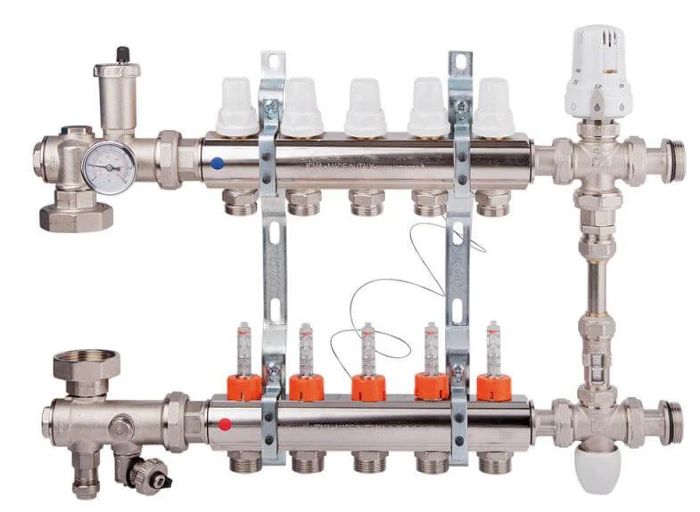 Колекторна група Icma 1" з 5 виходами та витратомірами A1K013APQ06 призначена для ефективного розподілу теплової енергії в системах водяної теплої підлоги. Вона забезпечує подачу теплоносія з високотемпературного первинного контуру котла у вторинний контур теплої підлоги із заданою температурою.