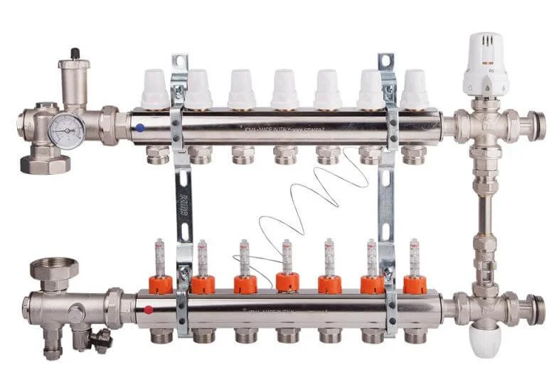 - Ефективний розподіл: Наявність 7 виходів забезпечує гнучкість у створенні окремих зон обігріву, а вбудовані витратоміри (№K0111) дозволяють точно регулювати потік теплоносія в кожному контурі.
