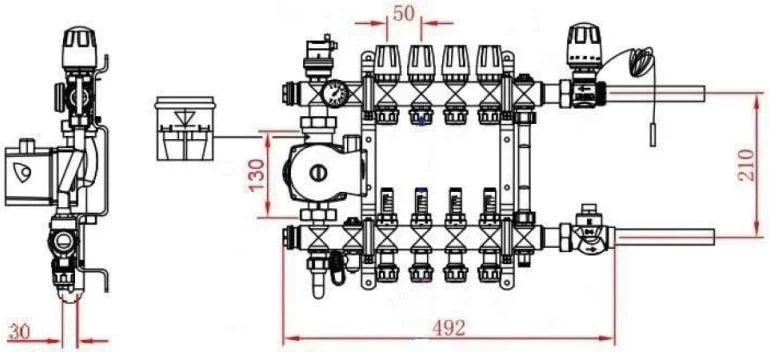 - Простий монтаж: Конструкція колекторної групи передбачає швидке та зручне встановлення на стіні або в спеціальній колекторній шафі, з можливістю підключення як справа, так і зліва.