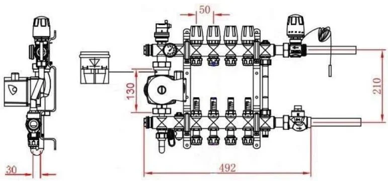 • Можливість автоматизації: Передбачена різьба 30х1,5 мм для підключення сервоприводів, що дозволяє інтегрувати колекторну групу в автоматизовані системи управління кліматом для підвищення енергоефективності та комфорту.