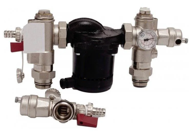 Кожна насосна група оснащена комплектом необхідних елементів для контролю та регулювання системи. До її складу входять термометри для точного вимірювання температури на подаючій та зворотній лініях, що дозволяє оперативно відстежувати роботу системи. Регульований клапан байпаса забезпечує гнучкість у налаштуванні потоку, а зворотний клапан запобігає небажаному зворотному руху теплоносія. Кульові запірні крани дозволяють легко ізолювати групу для обслуговування або ремонту.