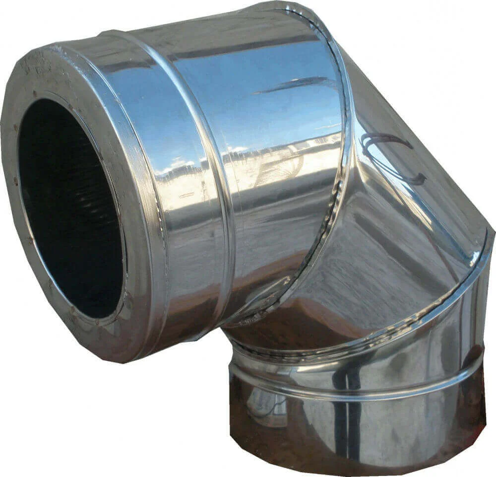 Двостінне димохідне коліно з кутом 90° призначене для ефективної зміни напрямку димохідного каналу, забезпечуючи надійне з'єднання вертикальних та горизонтальних ділянок системи. Конструкція типу «сендвіч» складається з внутрішньої труби діаметром 180 мм, виготовленої з нержавіючої сталі товщиною 0,5 мм, та зовнішнього кожуха з оцинкованої сталі. Між цими шарами розташований теплоізоляційний матеріал, що запобігає значним втратам тепла та утворенню конденсату.