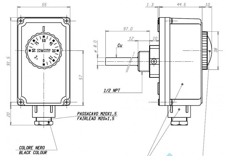 - Діапазон регулювання: термостат дозволяє налаштувати температуру спрацьовування в межах від 0 до 90 °C з температурним диференціалом 4 °C.