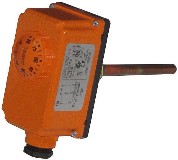 Занурюваний термостат TC2 встановлюється безпосередньо в середовище теплоносія на котлі або підвідному трубопроводі. Пристрій має пластмасовий корпус оранжевого кольору зі ступенем захисту IP40 та включає капілярний термоелемент (термобалон) у захисній гільзі діаметром 8 мм і довжиною 100 мм. Принцип дії заснований на розширенні рідини в термобалоні при нагріванні.