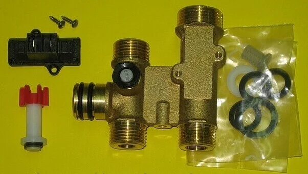 - Повна комплектація: До складу входить латунний корпус групи, поплавковий датчик протоку, герконовий вимикач, комплект прокладок та вбудований фільтр для захисту від забруднень.