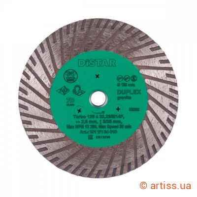 Круг алмазний відрізний Distar Turbo Duplex 125x2.8x8/25х22,23 M14F — це високоякісний інструмент, створений для професіоналів, що працюють з важкими матеріалами, такими як граніт і мармур.