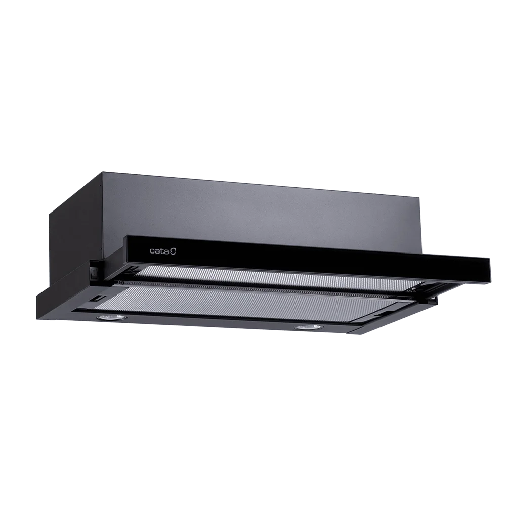 Вбудована телескопічна кухонна витяжка CATA TF 2003 60 чорний з чорною скляною панеллю ефективно інтегрується у верхню кухонну шафу, зберігаючи естетику інтер'єру та забезпечуючи функціональність. Її конструкція дозволяє висувати передню панель для збільшення площі забору повітря, що активує автоматичне увімкнення пристрою. Завдяки стандартній ширині 60 см, ця модель ідеально підходить для більшості варильних поверхонь.