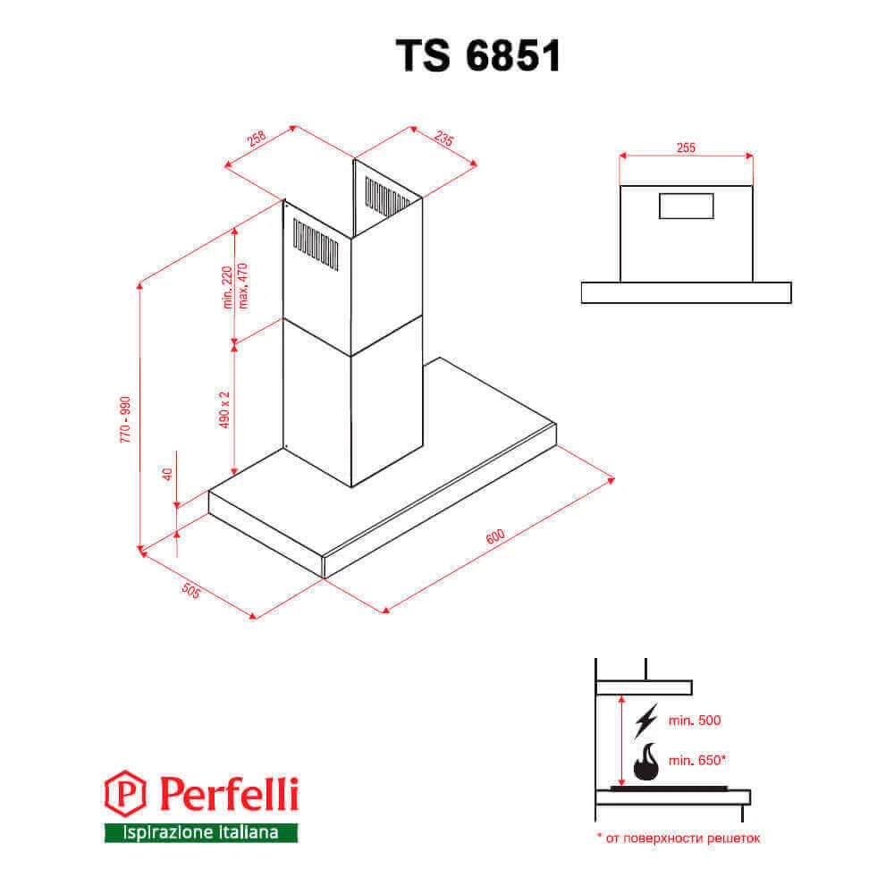 Кухонна витяжка Perfelli TS 6851 Т-подібної форми з пристінним типом монтажу є ефективним рішенням для очищення повітря на кухні, гармонійно доповнюючи сучасний інтер'єр. Корпус виготовлений зі сталі, а декоративні елементи зі скла підкреслюють стиль та додають затишку приміщенню.