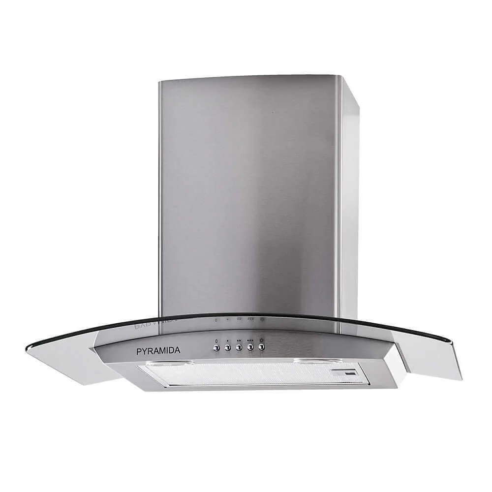 Кухонна витяжка Pyramida КR 60, виконана у пристінному Т-подібному форм-факторі, ефективно очищає повітря від випарів та запахів, що виникають під час приготування їжі. Її конструкція поєднує нержавіючу сталь та вигнуте загартоване скло, що надає моделі сучасного вигляду та забезпечує довговічність. Завдяки ширині 60 см, вона оптимально підходить для стандартних варильних поверхонь.