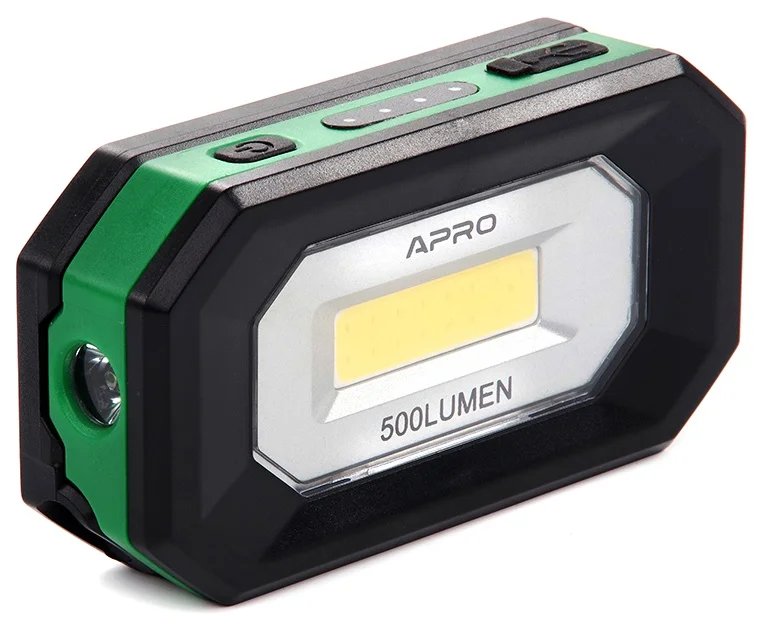 Оснащений світлодіодною технологією та потужністю 5 Вт, прожектор APRO забезпечує яскраве та рівномірне освітлення з максимальною яскравістю 500 люмен. Вбудований літій-іонний акумулятор ємністю 2000 мАг гарантує тривалу автономну роботу до 6 годин, що робить пристрій придатним для використання в умовах відсутності стаціонарного електроживлення.
