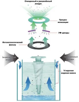 Основний принцип роботи базується на гідрофільтрації, де повітря проходить через водяну завісу, що формується шістнадцяти-ярусним циркуляційним нагнітачем. Цей процес дозволяє ефективно видаляти найдрібніші частинки пилу, алергени та нестійкі запахи, одночасно насичуючи повітря вологою. Додатково, УФ-лампа активує фотокаталітичний фільтр, який знищує віруси, спори рослин та стерилізує повітряний потік, а іонізація збагачує його негативно зарядженими іонами, роблячи повітря свіжішим.