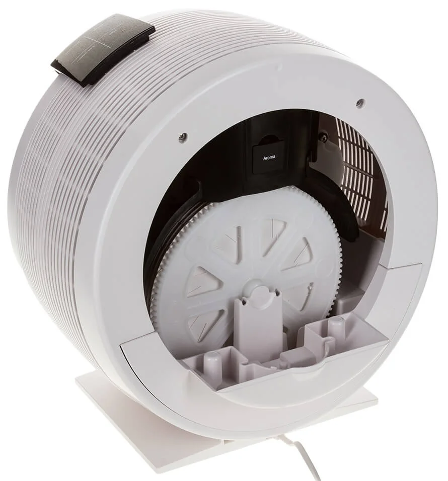 Всередині приладу обертаються пластикові диски з адсорбуючою поверхнею, які постійно зволожені. Повітря, проходячи через ці диски, очищається від пилу та зволожується, а всі забруднення змиваються у піддон. Важливою особливістю є відсутність змінних фільтрів та витратних матеріалів для очищення повітря, що спрощує експлуатацію та знижує витрати. Керування здійснюється за допомогою сенсорної панелі, а вбудований гігрометр дозволяє контролювати рівень вологості. Для додаткового комфорту передбачений контейнер для ароматичних олій, що дає змогу проводити ароматерапію. Дезінфікуючий срібний стрижень DSS, що входить до комплекту, забезпечує знезараження води, запобігаючи розмноженню бактерій. Пристрій також має вбудований режим очищення зволожуючих дисків та працює з низьким рівнем шуму – менше 25 дБ(А).