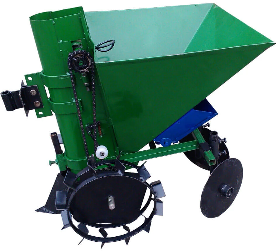 Конструкція забезпечує повний цикл посадки картоплі: від формування борозни до загортання клубнів та створення гребеня. Привід ланцюгового транспортера здійснюється від грунтозацпів, що синхронізує процес посадки з рухом мотоблока. Регульовані дискові окучники на підшипниках діаметром 280 мм забезпечують точне загортання.
