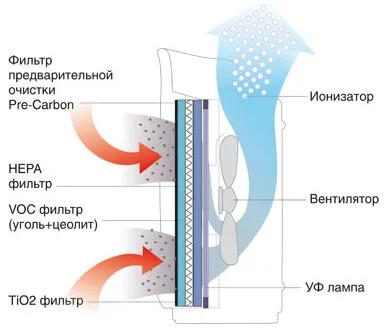 Система очищення включає Pre-Carbon фільтр для великих частинок, протиалергенний HEPA-фільтр, що затримує до 99% частинок розміром до 0,3 мкм, та VOC-фільтр (вугільний з цеолітом) для абсорбції запахів та хімічних сполук. Додатково, титан-оксидний фільтр під впливом ультрафіолетових променів окислює органічні та неорганічні забруднювачі, розкладаючи їх на неактивні компоненти та знешкоджуючи віруси й бактерії.