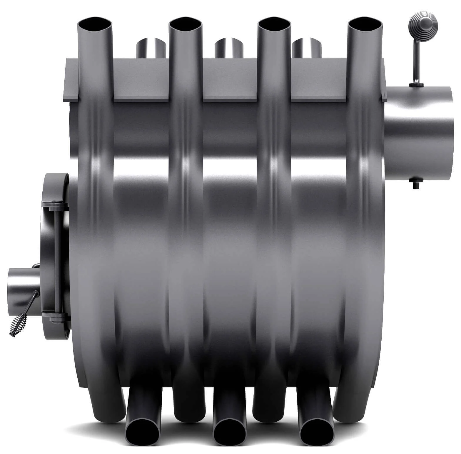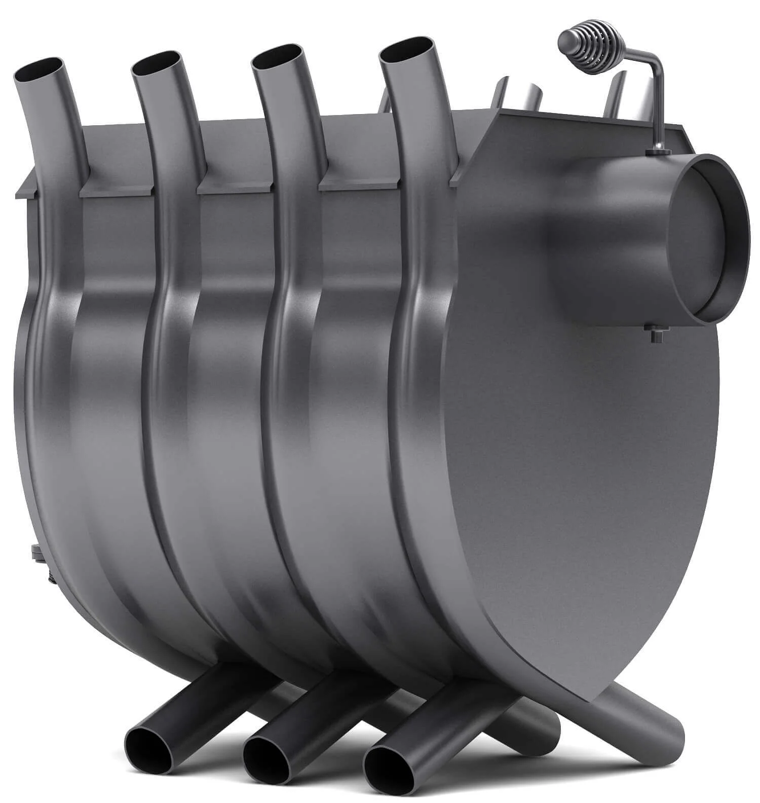 Система теплообмінних труб, що оперізують топку, забезпечує швидке та рівномірне прогрівання приміщення. Холодне повітря з нижніх отворів труб нагрівається, проходячи через них, і виходить гарячим (до 80-120°C у режимі тління) у верхній частині, створюючи інтенсивну циркуляцію. Об'єм топкової камери становить 50 літрів, а діаметр димоходу — 120 мм. Регулятори подачі повітря на дверцятах та димоході дозволяють точно контролювати інтенсивність горіння та тривалість роботи на одній закладці палива, яка може сягати 4-8 годин.