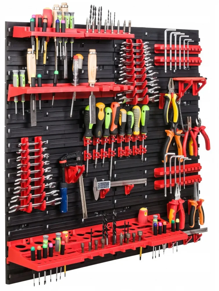 Система оснащена спеціальними монтажними отворами, що забезпечують швидке та легке кріплення на будь-якій стіні. Це сприяє підтримці порядку, робить інструменти доступними та впорядкованими, оптимізуючи робочий процес. Комплект постачається з усіма необхідними тримачами та контейнерами для зручного розміщення різноманітного інструменту.