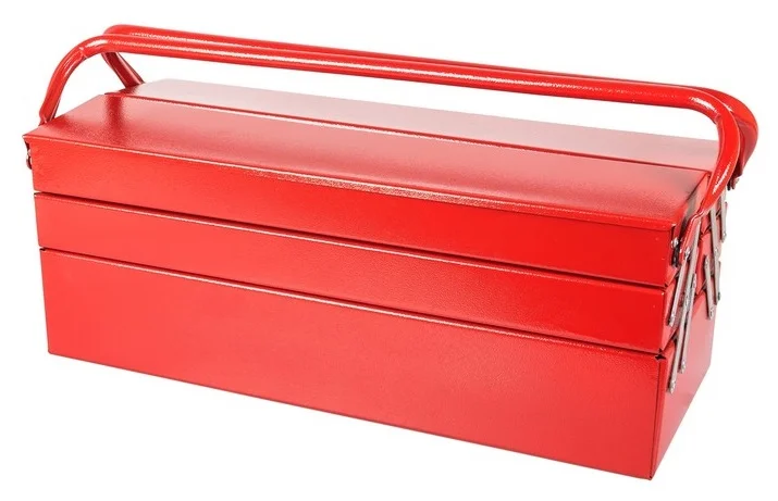 Модель має 3 яруси та 5 відділень, що дозволяє ефективно розділити інструменти за призначенням та розміром, забезпечуючи швидкий доступ до необхідних предметів. Поверхня скрині покрита порошковою фарбою, яка захищає метал від корозії та подряпин, зберігаючи естетичний вигляд виробу. Компактні розміри 550 мм та вага 4,8 кг роблять її зручною для транспортування та зберігання в гаражі, майстерні або на робочому столі.