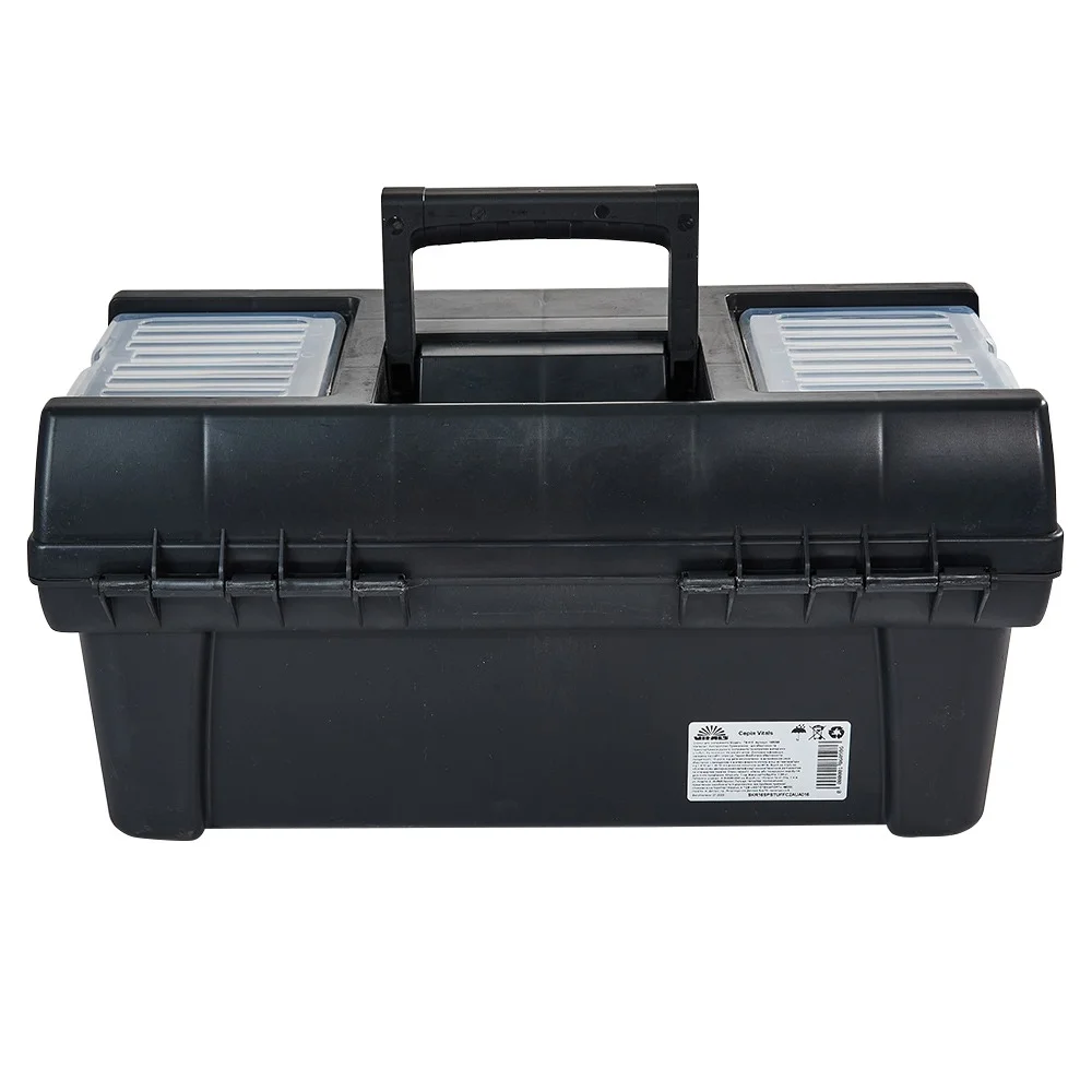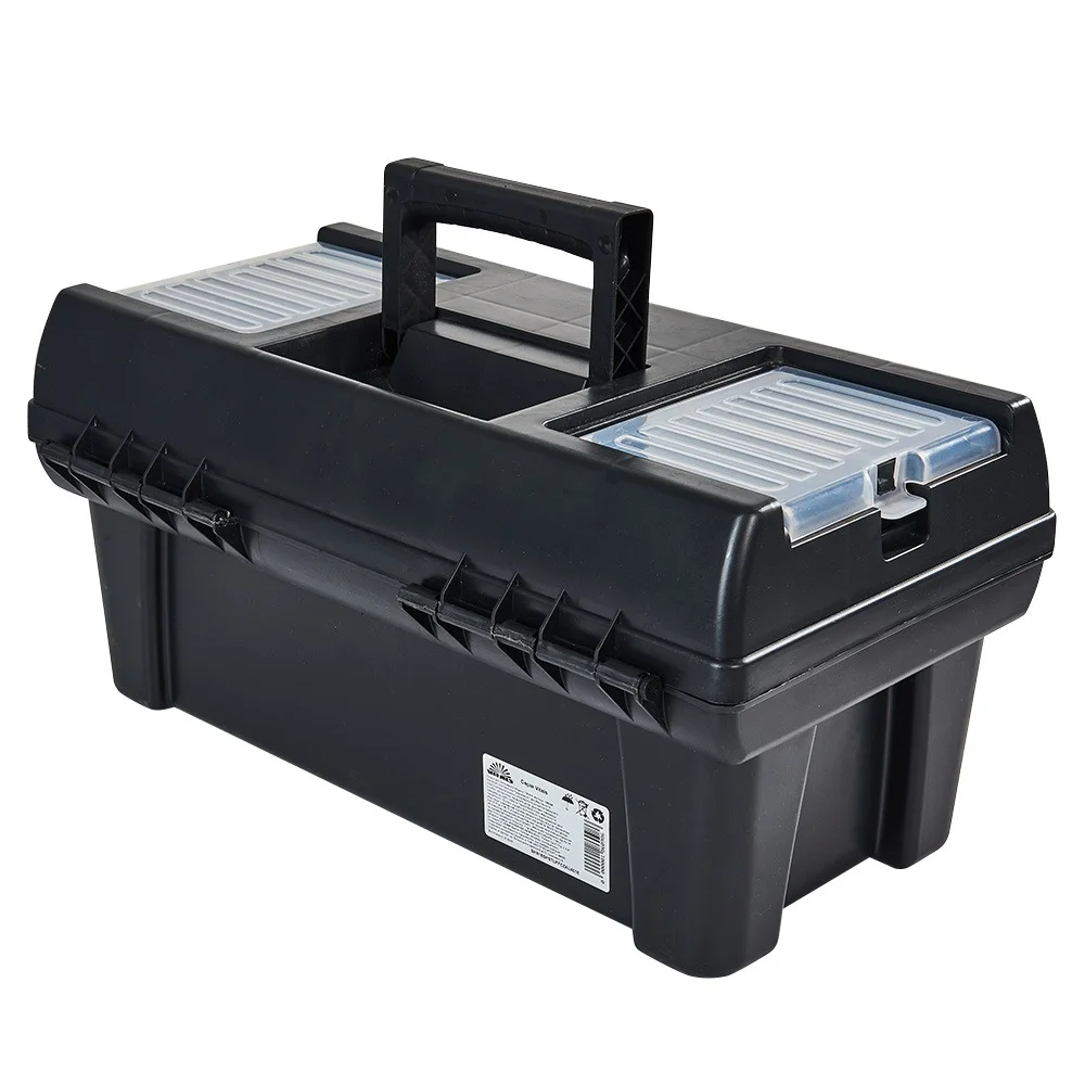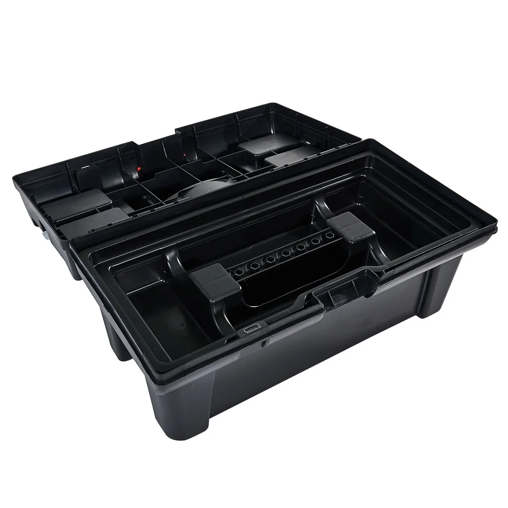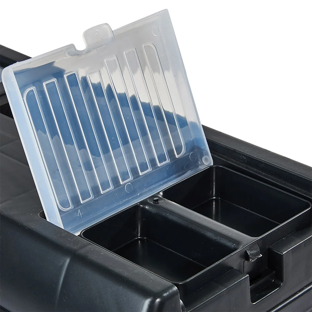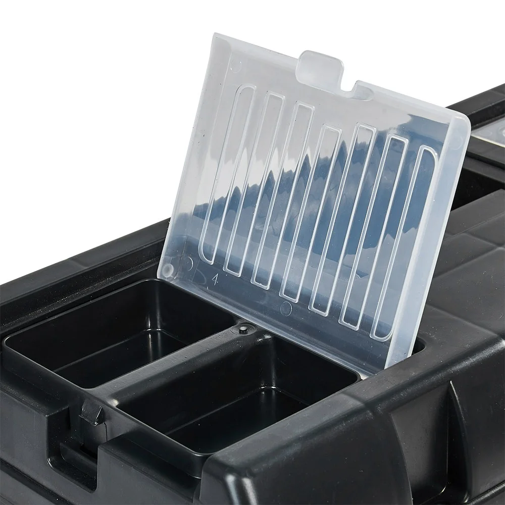 Модель оснащена двома вбудованими органайзерами у кришці, що дозволяють зручно розміщувати дрібні деталі, такі як саморізи, гайки, біти та свердла. Всередині ящика розташований переносний знімний лоток з гніздами для біт, що сприяє ефективній організації робочого процесу. Пластикові замки підвищеної міцності надійно фіксують кришку, а спеціальний отвір для навісного замка надає додатковий рівень безпеки.