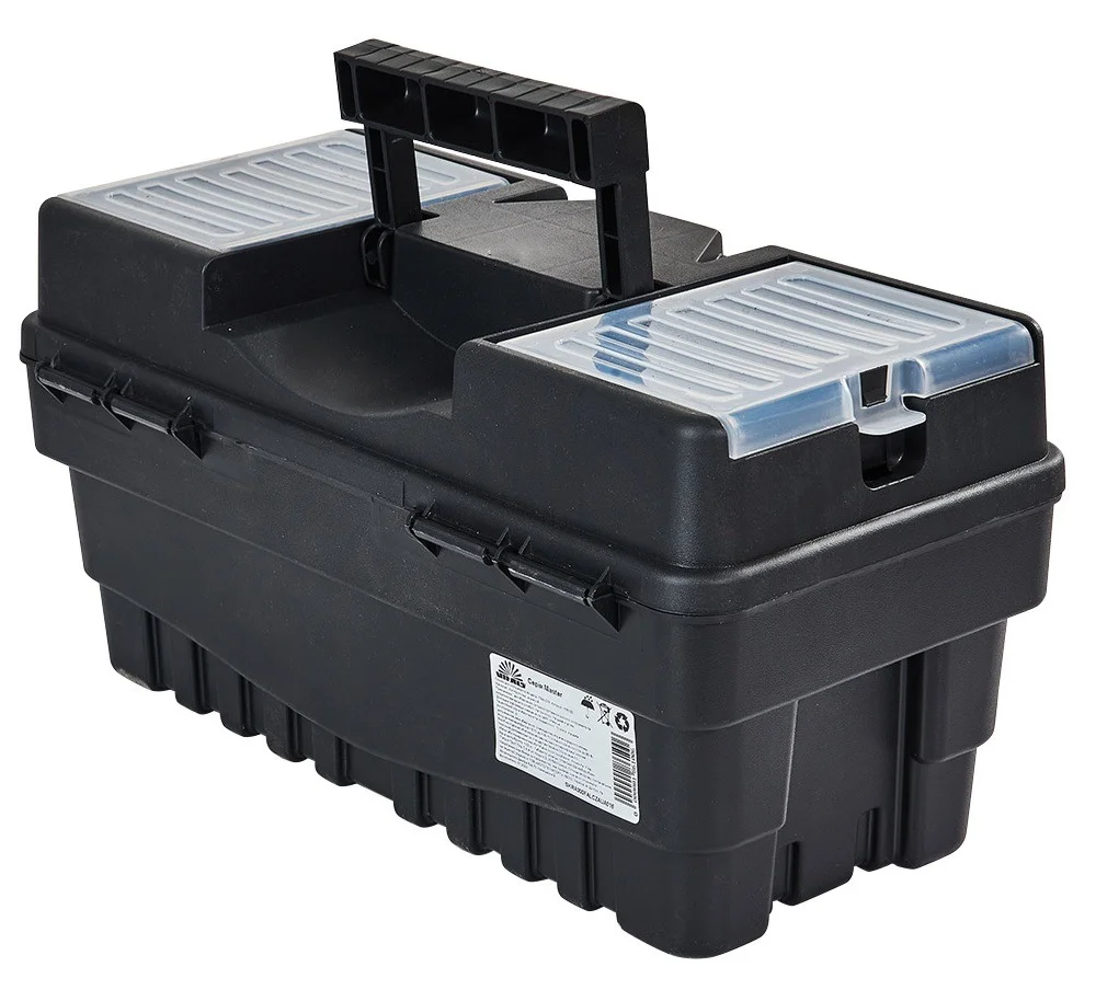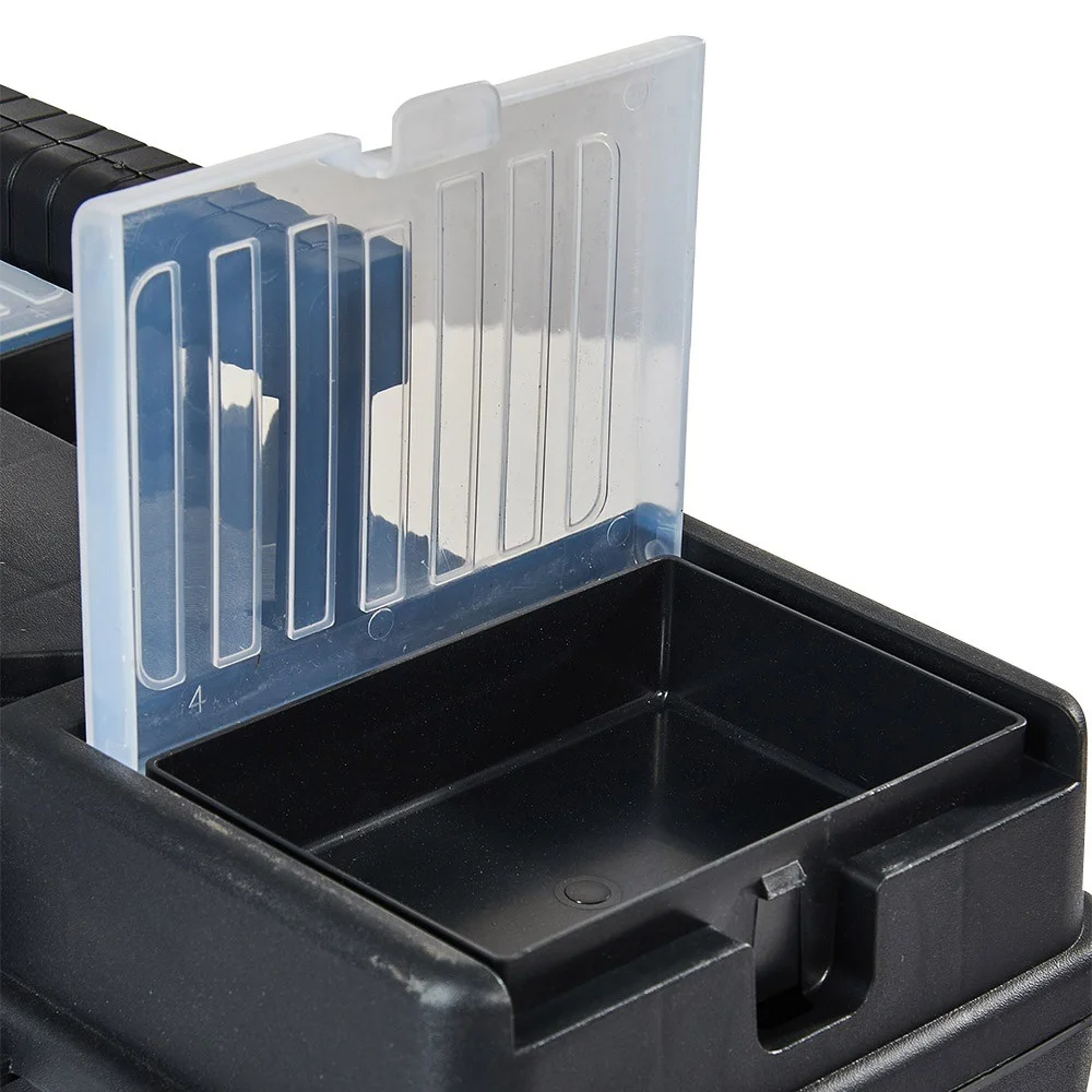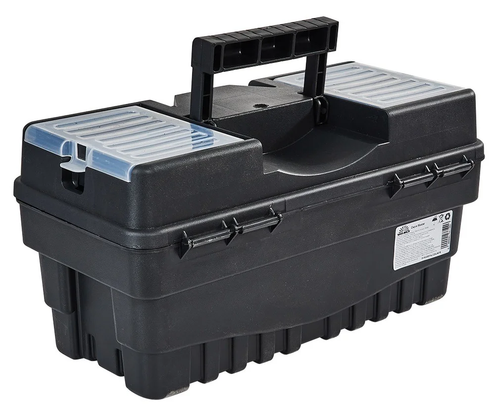 Модель оснащена функціональними органайзерами, інтегрованими у кришку, які ідеально підходять для впорядкування дрібних деталей, таких як саморізи, гайки, свердла або інші кріпильні елементи. Всередині ящика розташований знімний лоток зі спеціальними гніздами для біт, що забезпечує швидкий доступ до найчастіше використовуваних аксесуарів та інструментів. Металеві замки надійно фіксують кришку, запобігаючи випадковому відкриттю під час перенесення, а отвір для навісного замка додає додатковий рівень безпеки для цінного вмісту.